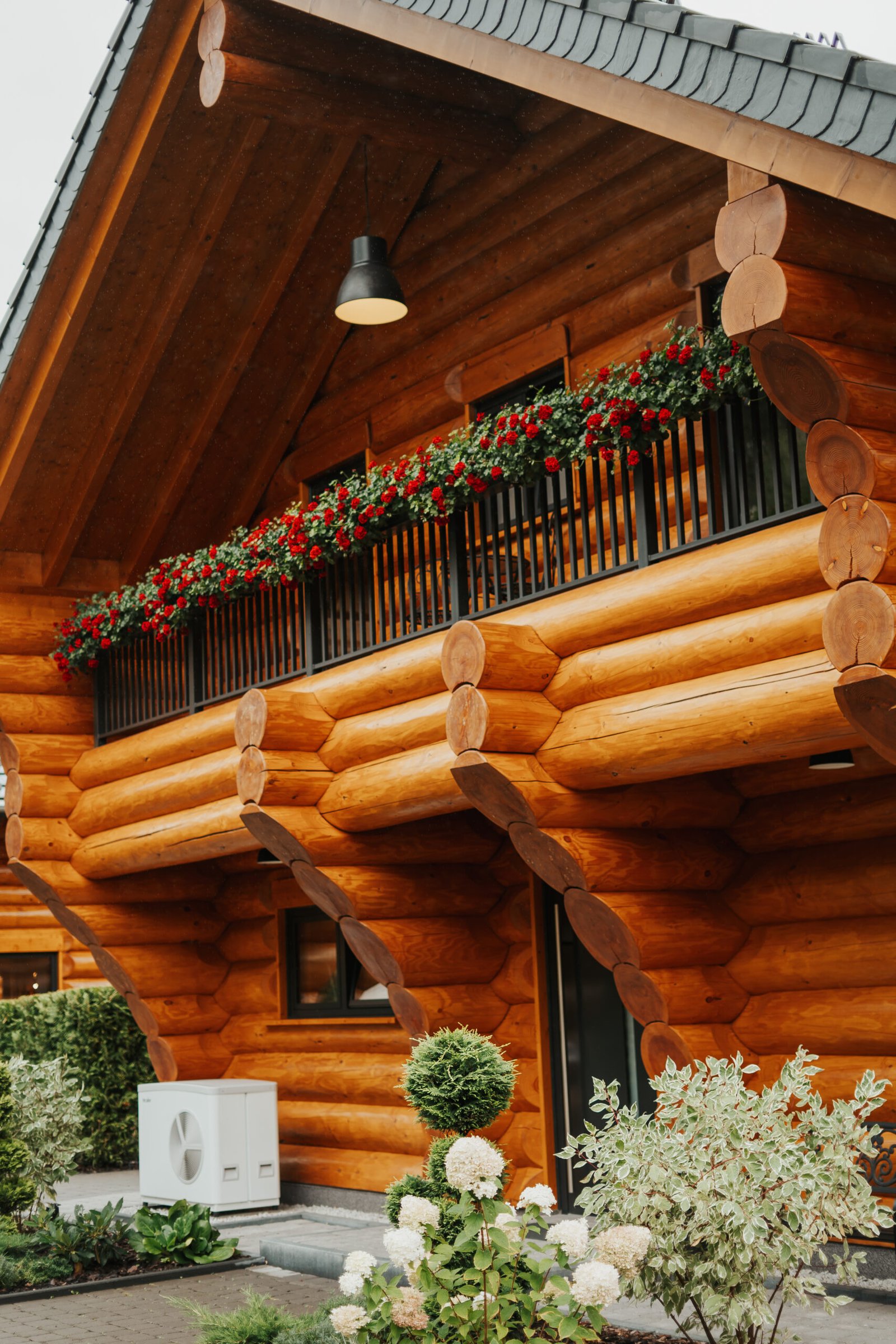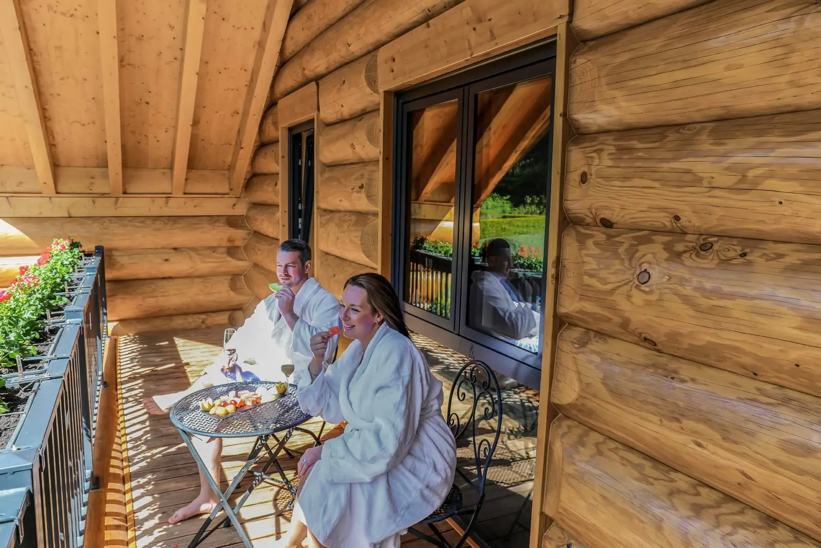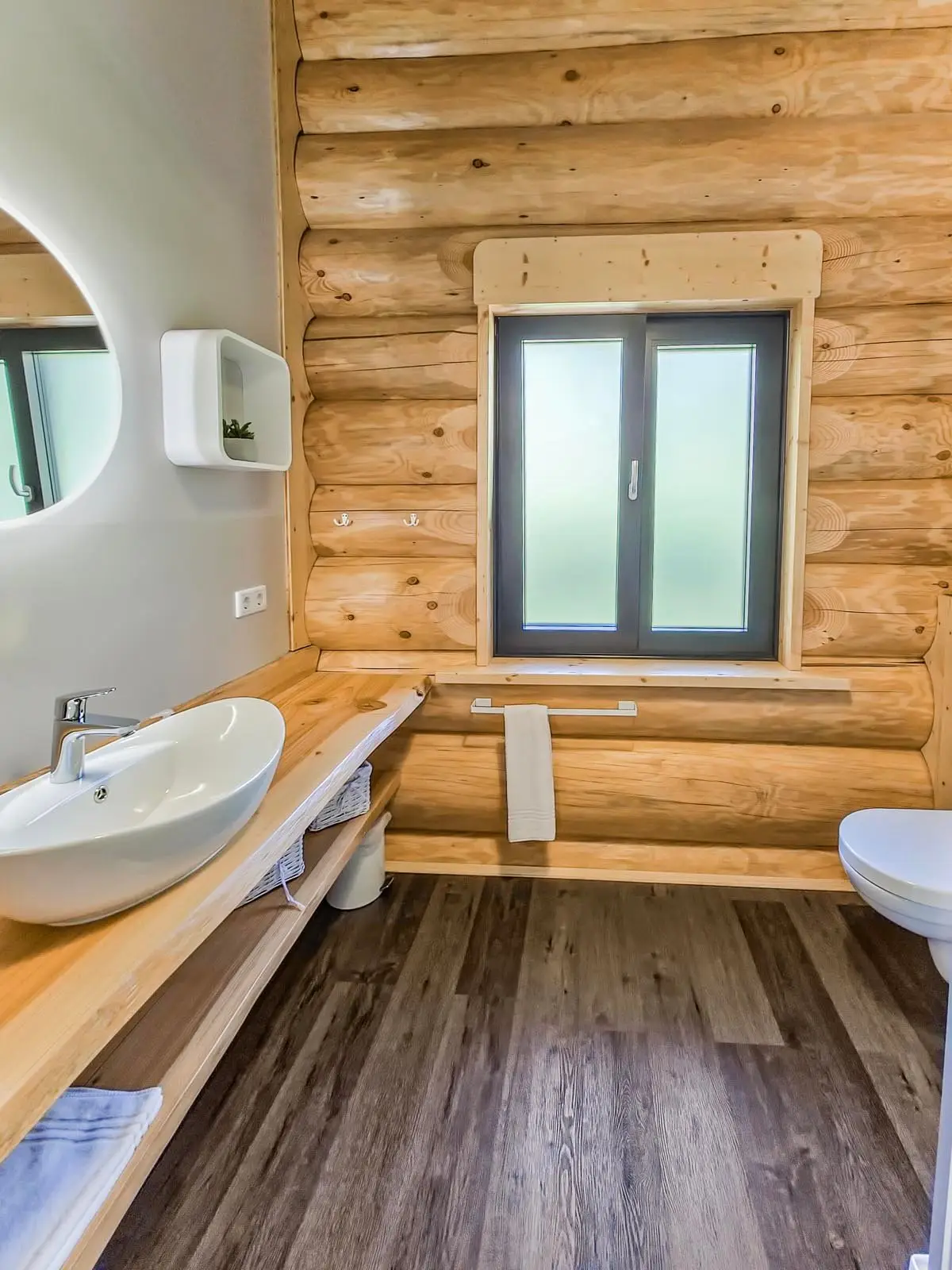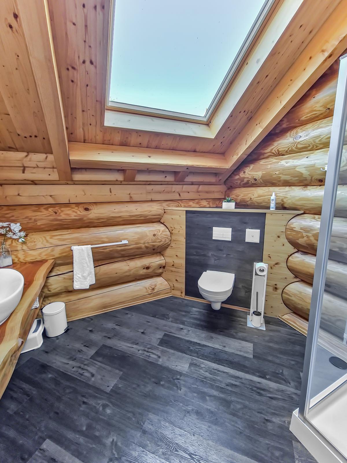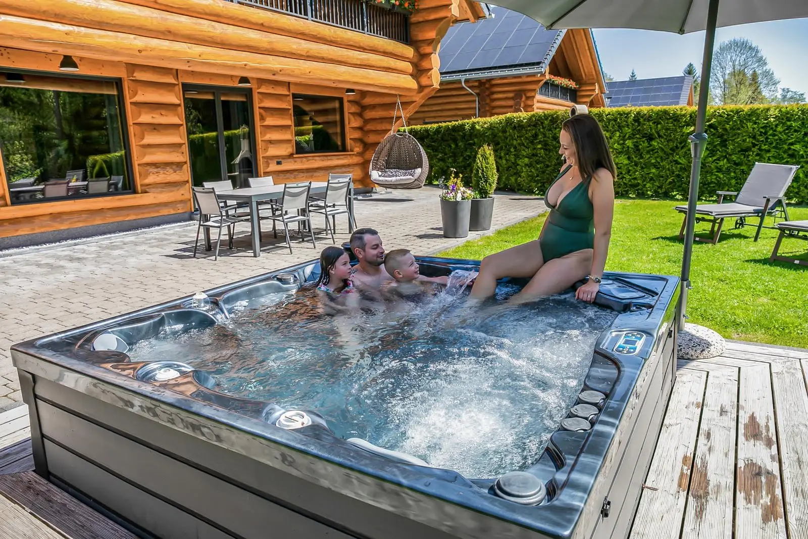 Ihr Ferienblockhaus verfügt über 3 komfortable Badezimmer, eine große Panoramasauna und einen Outdoor-Whirlpool für 5 Personen.