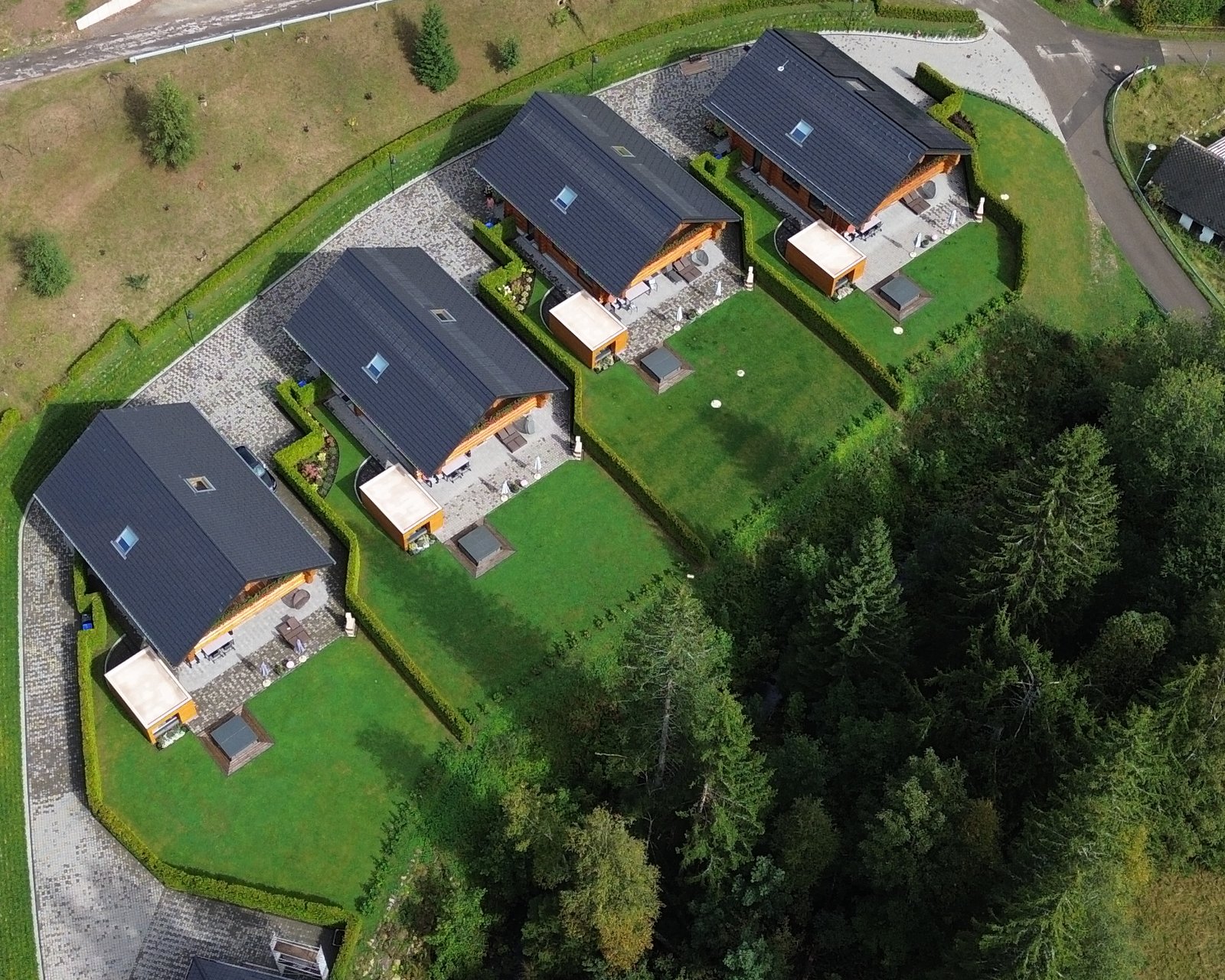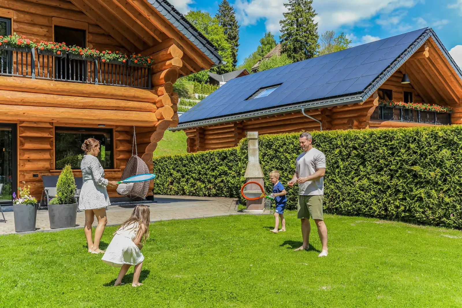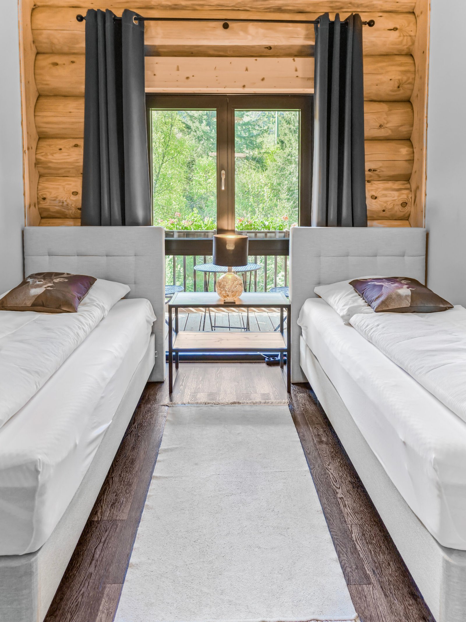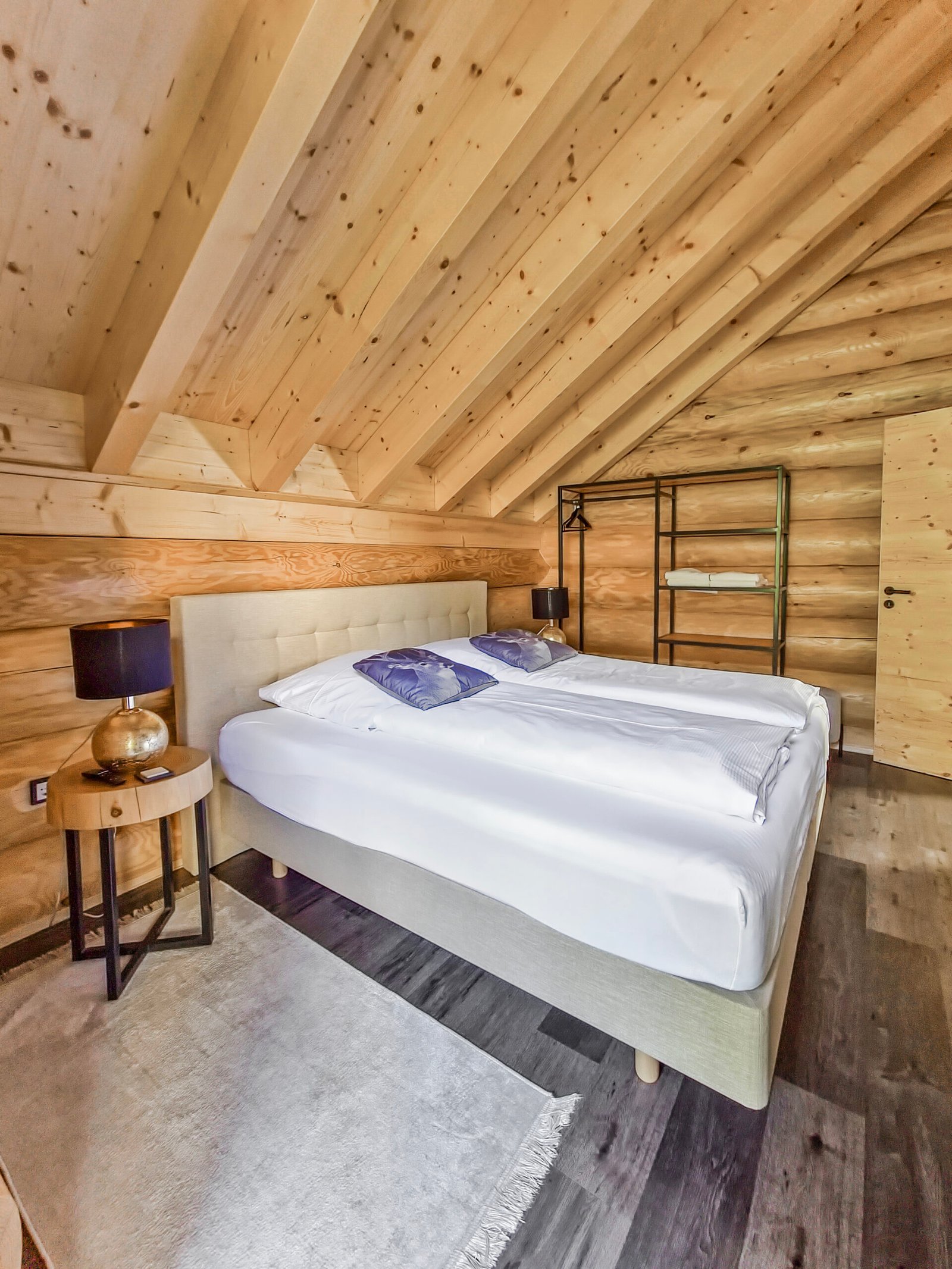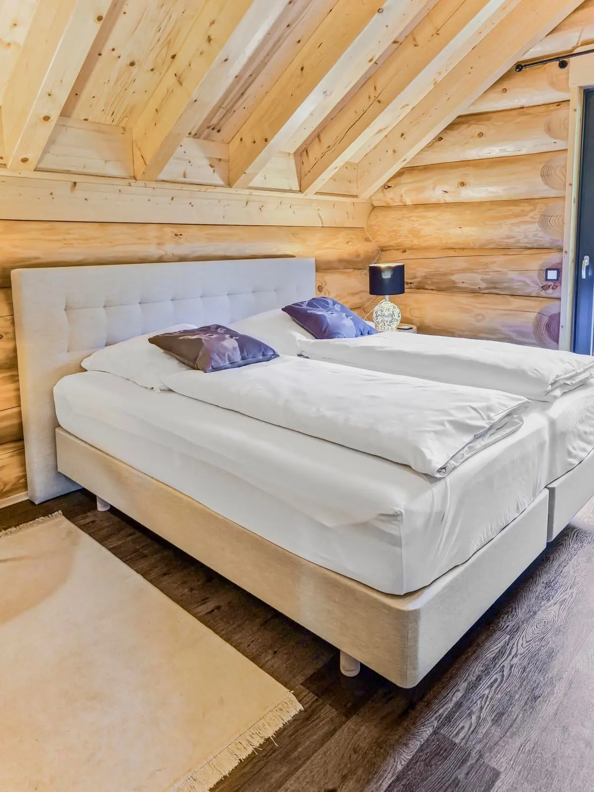 Ihr Ferienblockhaus verfügt über 5 Schlafzimmer, eines mit 2 Einzelbetten und 4 Schlafzimmer mit jeweils einem Doppelbett. Alle Schlafzimmer sind mit hochwertigen Boxspringbetten und jeweils einem Smart-TV ausgestattet.